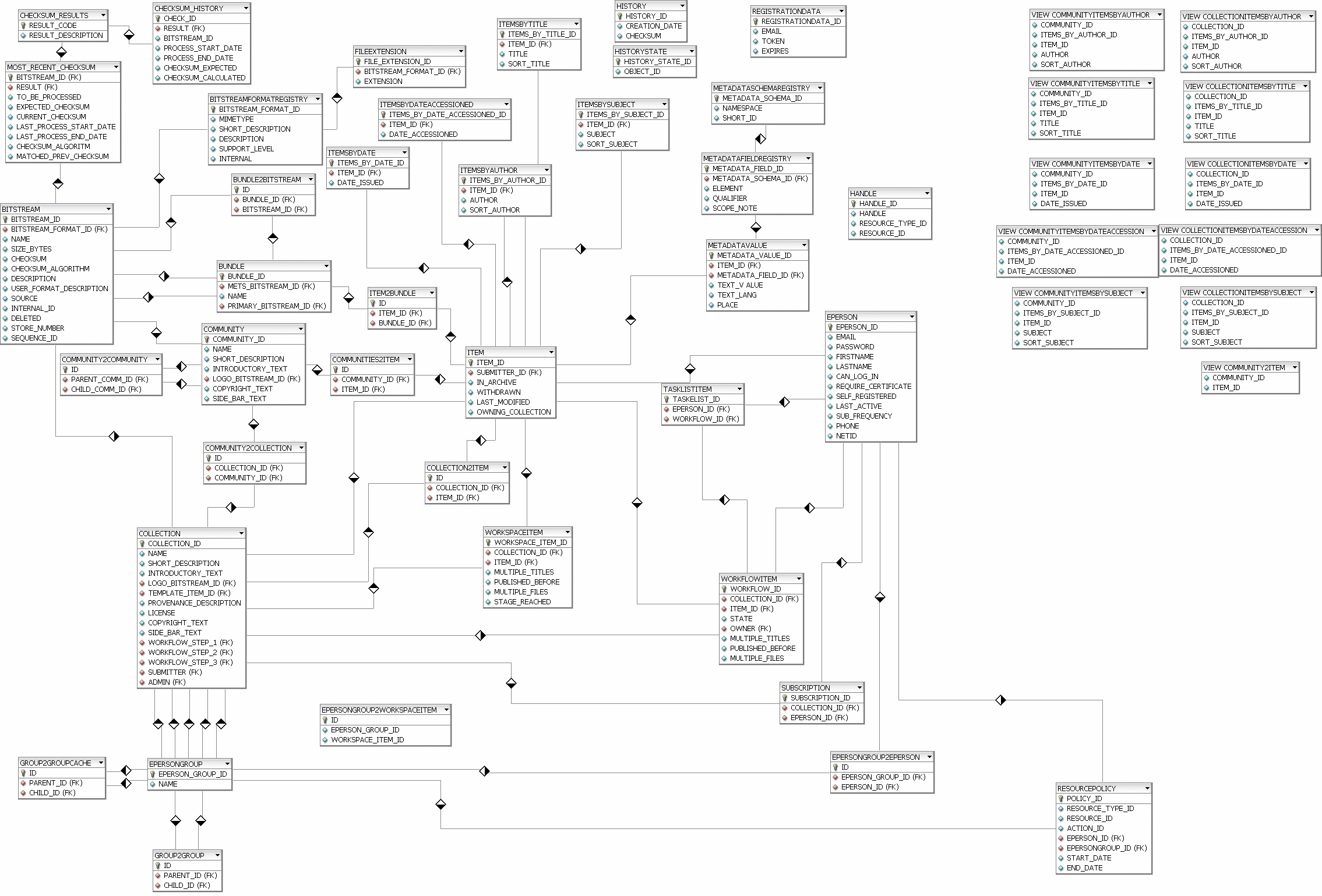 DSpace uses a relational database to store all information about the organization of content, metadata about the content, information about e-people and authorization, and the state of currently-running workflows. The DSpace system also uses the relational database in order to maintain indices that users can browse.