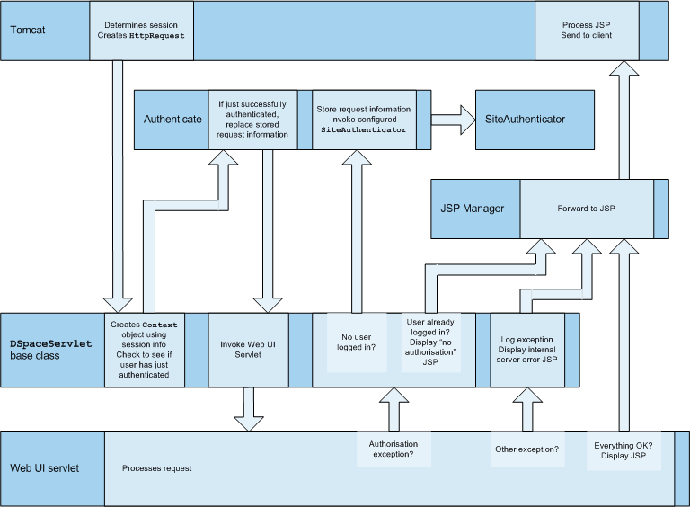 The appropriate servlet is invoked, and processes the request by invoking the DSpace business logic layer public API